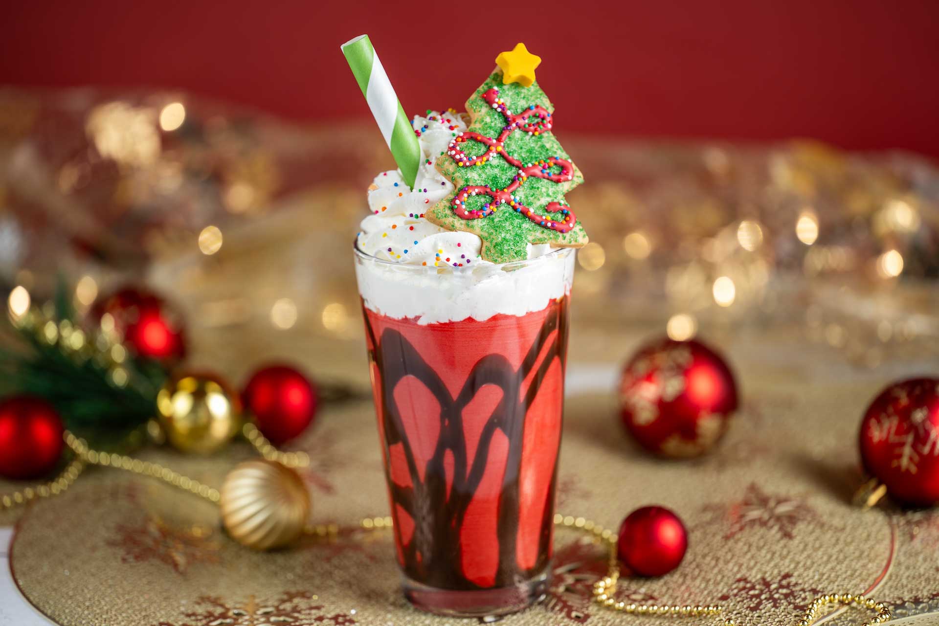• Red Velvet Holiday Milk Shake: Red velvet milk shake swirled with chocolate sauce and topped with whipped cream, rainbow sprinkles, and a holiday tree sugar cookie