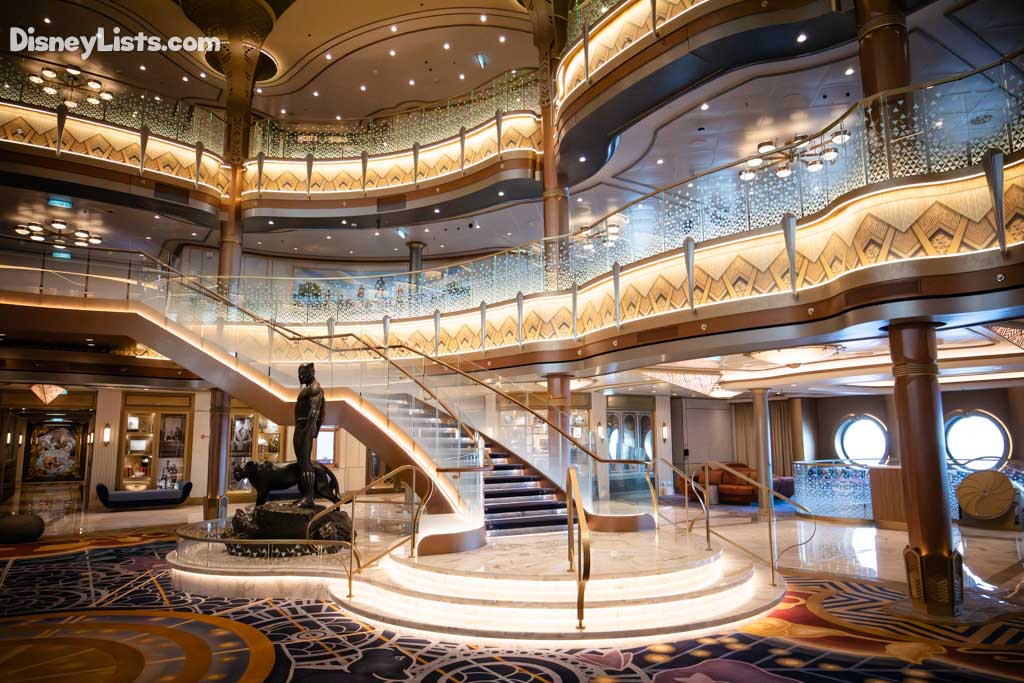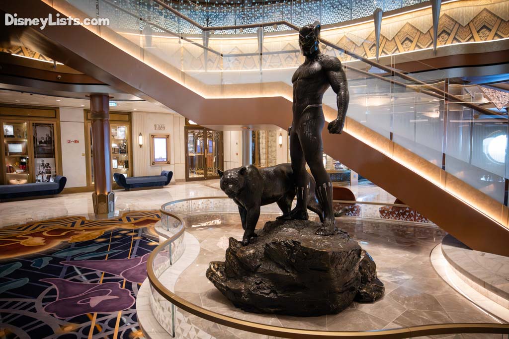 The Grand Hall is often referred to as the heart of a Disney Cruise Line ship. It’s where so many things happen, from those first moments of stepping onto the ship, to character meet and greets, to other special surprises throughout the cruise. The design of the Grand Hall is inspired by Marvel Studios’ Black Panther films, including a stunning statue of the Black Panther himself at the heart of the space. We loved this space for its unique Wakanda-themed design, especially the Black Panther statue, the first Marvel character to be featured in a Disney Cruise Line Grand Hall.