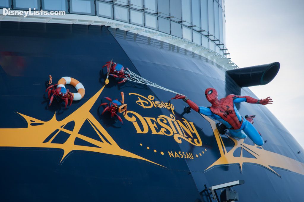 And, for the first time in Disney Cruise Line history, a Marvel Super Hero is the signature stern character on the Disney Destiny, with a larger-than-life sculpture of Spider-Man and his Spider-Bots decorating the filigree on the back of the ship. We loved seeing Spider-Man on the back of the ship and it was great to interact with Marvel characters like Loki on the ship as well.