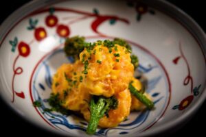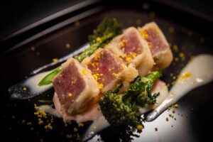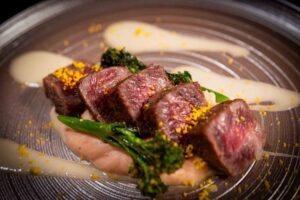 - Crisp Tempura of Japanese Black Waygu with Sakura-infused mashed potatoes, tender broccolini, sweet sake velouté, and toasted egg crumble