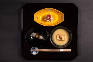 For course number two, we had the chilled seasonal appetizer. This course features a Charcoal-Grilled Razor Clam & Tataki-Style Spanish Mackerel that is one of the most visual items on the menu, served in an actual clamshell. It’s accented with sea urchin, wasabi jelly, egg yolk vinegar emulsion, fine myoga julienne, and edible blossoms.
