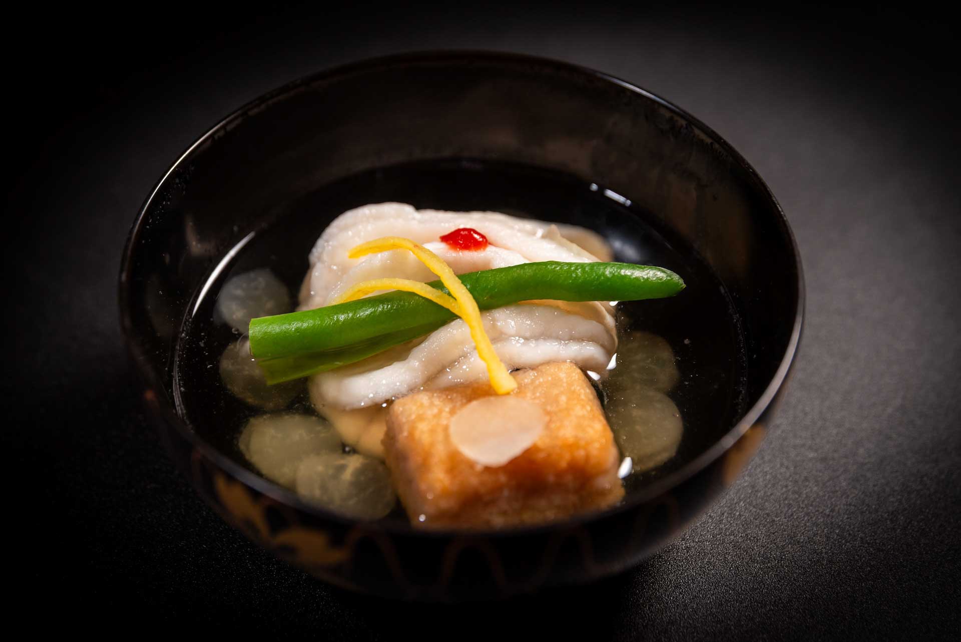 - Lightly Fried Tofu in Silken White Miso Broth served with Japanese mustard and pickled cherry blossom